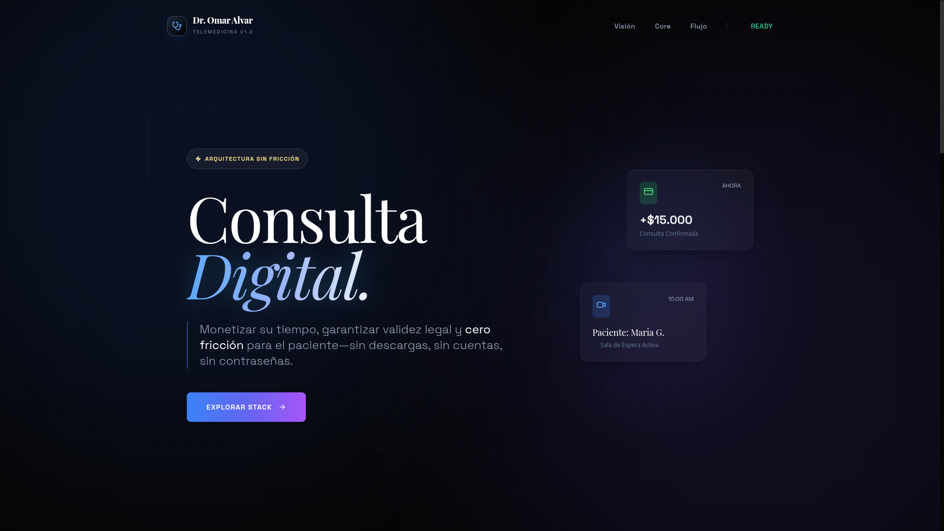 Telemedicina full-stack: onboarding cero, pagos inmediatos vía Mercado Pago y documentación clínica segura.